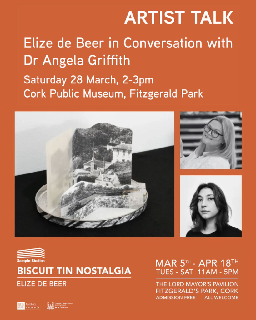 Join the in-depth discussion with artist Elize de Beer and Dr Angela Griffith, Assistant Professor of History of Art and Architecture at Trinity College Dublin, in Cork Public Museum on Saturday 28 March from 2-3pm as part of Elize’s solo exhibition Biscuit Tin Nostalgia. Elize and Angela will be reflecting on the exhibition and key ideas around land and archival research within Elize’s artistic practice.