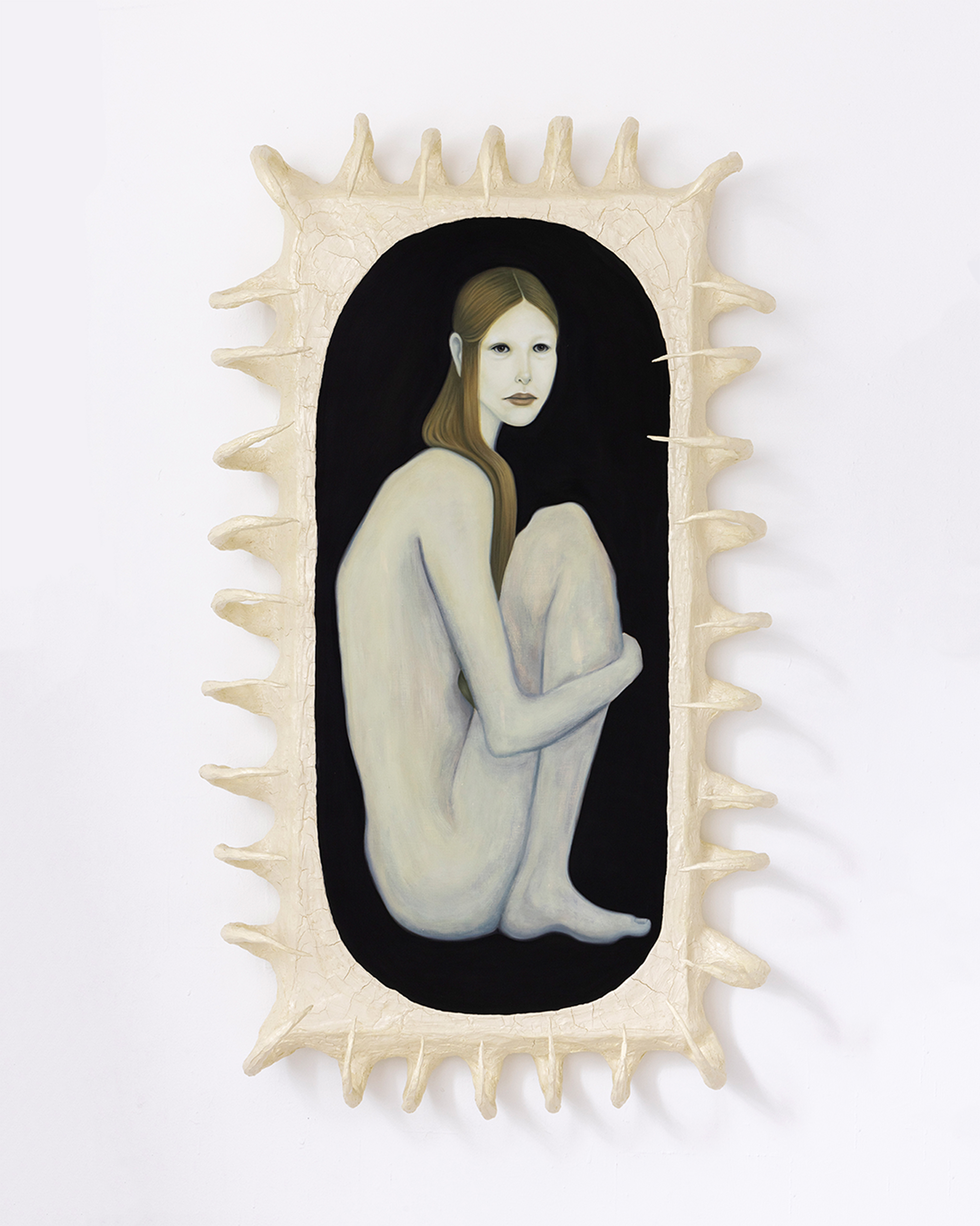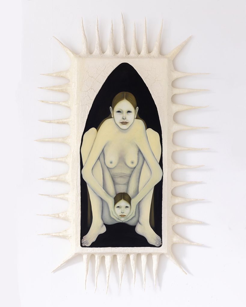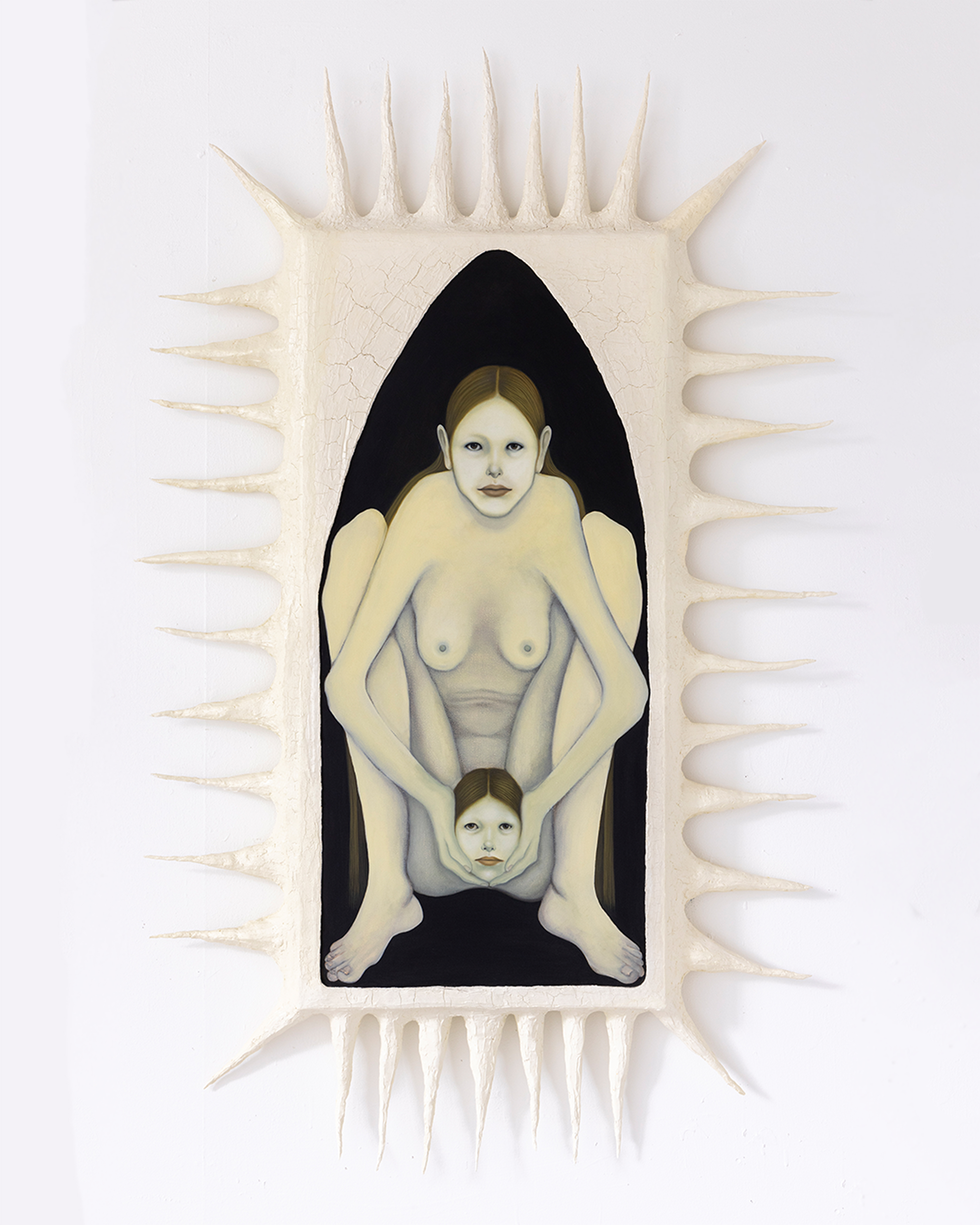 Her oil paintings convey themes of transformation, primarily concerned with rites of rebirth. Inspired by the ecclesiastical tradition of reliquaries, the paintings are guarded within protective, skeletal frames, made using sculptural processes Quinn developed during her undergraduate studies. Their design draws from investigations into religious ornamentation and rock formation found in caves. This research corresponds with the fundamental motivation of Quinn’s current practice – revealing the latent role of religious myth as an allegory for that which is inherently psychological and subjective.