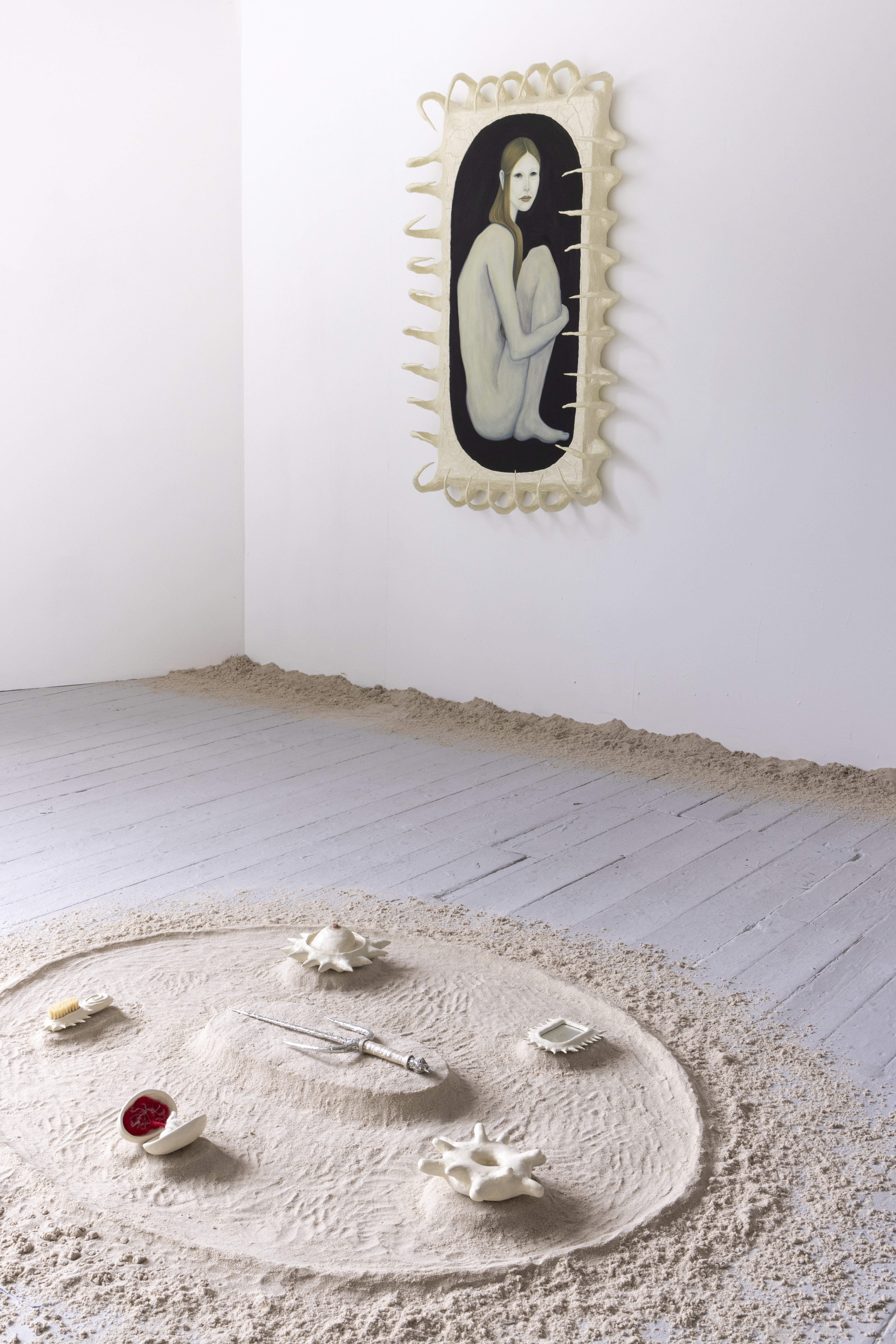 By harnessing archetypal content rooted within mythology, Quinn is conducting a demonstration of self-mythology. Within her paintings, she is projecting her own likeness upon the fabled figure of Lilith, reclaiming her tarnished mythology in its association with the biblical chapters of Genesis as a means to ultimately reinvent herself, the artist, in the process. Quinn contextualises this work as an installation that imitates a spiritual site akin to a tabernacle, rousing a cathartic ritual of rebirth in order to demonstrate the proposed sanctity of this process.